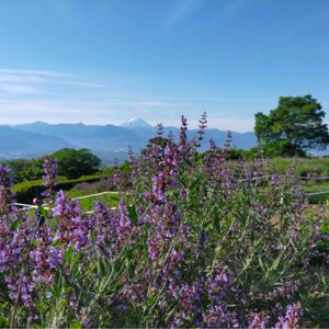 向こうに小さく富士山が見え 綺麗な色のサルビアプラテンシスが 咲く素敵な風景I ♪︎