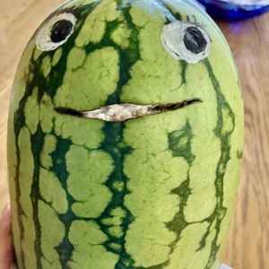 こんにちは😃 昨日 初採りの小玉スイカ🍉 ラグビー🏉 少しヒビが入ってて 今朝見たら フフフ🤭 ①イタズラしてみるよね〜👀 口はそのままですヨ〜 今朝また丸いの 2個 甘いのはラグビー╰(*´︶`*)╯♡ ③イチモンジチヨウがヒラヒラ 飛んでる散歩道 ④⑤今 ハマスゲが沢山 良く観ると 咲いてるようです これは色の無い線香花火🎇 日曜日のお戯れ🍉🎇😜