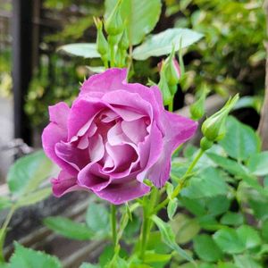 薔薇 ブルーフォーユー ワーナーのFL、やっと開花スタート 例年4月末か5月頭には咲く早咲きの品種ですが、咲きそうでなかなか開かなかった 寒かったものね~ 神秘的な紫色 ここから数日咲き進むにつれ、独特の青みをましていきます😊