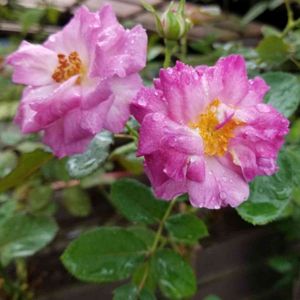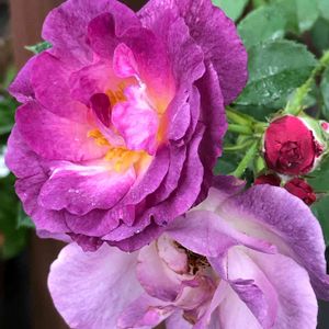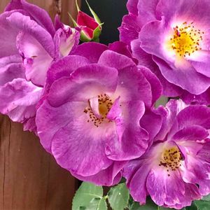 薔薇ブルーフォーユー 次々咲きだした😃春の爆咲きには全く及ばないけれど、房で蕾がついています 本来、早咲きなので、もしかしたらこれは秋の開花のつもりなのでしょうか? この所、涼しくて☔も多いしね 雨なのに香りが漂ってきます