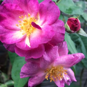 こんにちは🎶 土砂降りが小雨になりました🌂 昔はこんなに大雨被害なかったのに… 3回目開花のブルーフォーユー🌹 紫と言うより濃いピンク 最初の花が下の花で、 色が薄くなってます💕 蕾も赤に近いピンクで可愛い‼️ 🏷金曜ローズショーに参加😊