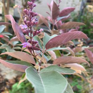 【西洋ニンジンボク】 (ミツバハマゴウ) 『プルプレア』 (パープレア) お花咲きました🌸 淡いお色が素敵な子💓 育てている印象… りんご箱プランターに植えていて 一年中屋外雨ざらし 表葉はシルバーがかり 葉裏はパープル 葉色が美しいニンジンボク 枝はそれほど太くならず柔らかい 何年も育てているが直径1cmぐらいかな 剪定すると横へと枝を2本出すので樹勢が強くひろがるイメージ 特性をみると成長が遅いと書いてある… 広い庭で育てるなら遅いと思うかも… 狭いりんご箱では邪魔になるので 毎年お花が咲いていないところをカットしてしまう(本当の剪定時期は咲き終わる頃と冬だったかな) 樹高40〜50cmにとどめている 適当管理で毎年お花を咲かせてくれる優秀な子 このままナチュラルな感じを続けるか 下の方で枝をどんどん分岐させて枝数を増やし沢山お花を咲かせようか もっと似合う鉢を探してあげるか悩み中😊