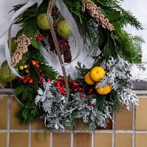 皆さんの投稿に刺激され何十年ぶりにリースを作りました。 楽しようと土台になる輪を買いに行ったら既に売切 裏庭に在る物等で完成に1時間以上玄関のベンチで寒かった! 材料費ゼロ円‼️🎄