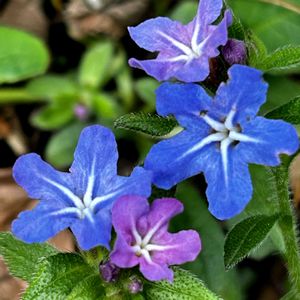ホタルカズラ(蛍葛)💙💜🩷 ムラサキ科 ムラサキ属 名前の由来 草むらの中に点々とつける花の色を蛍の光に例えたもの 中の隆起した白い模様も星形に例える説がある 別名 ホタルソウ、ホタルカラクサ 日本各地の日当たりの良い山野や林縁の草むら、斜面、岩場に自生するこ常緑多年草 蕾はピンク、咲き始めは紫がかり、徐々に濃い青色(青紫)になり、ホタルカズラブルーとなる 茎や葉には細かい毛が見える 花は5深裂し、花の大きさは1.5cmくらい 茎が地面をはって伸びる、蔓性植物 個体数は多い方でした 中の隆起した白い部分はビロードのような細かい毛がある 山の中で青い花は特別感がありとても癒され、ずっと見ていたくて、その場からなかなか離れる事ができませんでした💙💙💙 4/26 撮影