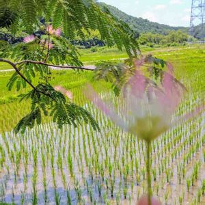今日も、青空🌤️。田植えもすんだみたいですね。 ネムノキです🍀。繊細な絹糸のようなお花ですね。 初めて見ました(*˘︶˘*).。*♡。 ちなみに持ってる花は落ちてるのを拾って写してみました😁。 岡山久米南にて。