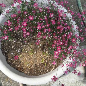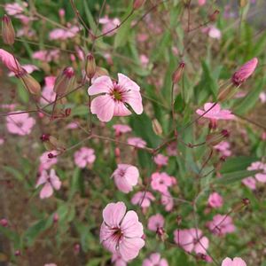赤花かすみ草 クリムソン 白花のかすみ草よりも小輪で、花径5mm前後の赤い小花が無数に咲きます。 草丈は白花より少し低めの早咲きで枝分かれの多い品種です。 ドライフラワーに最適です。 種まき 3~5月 9~10月 開花時期 6~8月 種まき:ピートバンやトレーにばらまきし、タネがかくれる程度に覆土します。 本葉2~3枚になったら3号ポットに1本ずつ仮植えします。 このとき用土は、水はけのよい培養土を使用します。 庭植えにする場合、日当たりと水はけと風通しのよい場所を選ぶ。 株間は30cm間隔で植えつけ、鉢植えは6号鉢に1株が目安です。 多湿が原因で生育が悪い場合があり 水を控えめにし様子を見ます。 害虫はアブラムシがつきやすいので、月に2回ほど株の周りに粒剤の殺虫剤をまきます。
