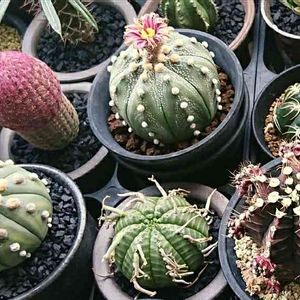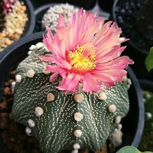 サボテン科 アストロフィツム属 新昭和赤花兜、兜錦、大疣碧瑠璃兜、碧方玉。😸😸 肌寒くなってきてるのに、サボテンさん達は今のところ元気です。😋 そんな中、蕾がひょっこりしてきてるのがチョコチョコ居ました。😀(笑)