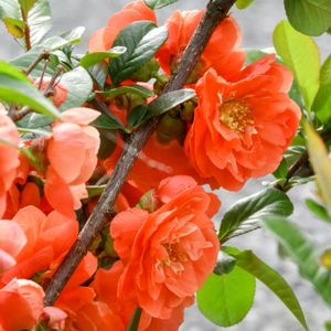 大きな木瓜の花 通り道のお宅のお庭に フェンスの隙間から📷撮りました。 お花が倍近くあります。 病院の帰りに
