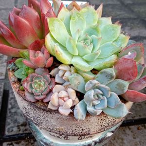 こちらは元は3年前に寄植え教室に参加した時の 残骸多肉+2軍エケの寄植え 当時の苗は2種類しか残ってません😭 向正面で写ってないけど多分 オウンスローとウィンドオブチェンジ 手前も名無しばかり💦 ドヤ顔に広がったカレンダーセットのシルエットを 堂々とど真ん中に😝 葉が広がり過ぎで半分中に浮いてます🤭 ⬅️相府連×コロラータ ➡️シャルモン ↓寄植え教室鉢の更新