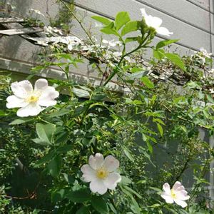 草笛の丘より我が家に嫁入りしました💒👰💍 ロサカニナ・クレーム様でございます ロサカニナはご存知原種でローズヒップが採れる事でも有名なバラですが、 こちらのクレーム様は八重咲きでしかも返り咲き♡♡ 一季でも全然良かったんですが、ヒップが採れるバラが小屋に誘引されてたらステキだな~と常々思っていて、でもロサカニナはほとんどシングルだし、それがちょっと引っかかって踏み切れないでいました。 このクレーム様はハンガリーのゲシュウィンズさんのバラで、草笛のおじさんが自ら輸入した珍しい品種だそうです! ランブラーのサンダースホワイトと迷ったんだけど、サンダースさんはかなりの暴れん坊でシュートがビシバシ出ていたので、脚立に上ってシュートの処理が大変になると嫌なのでやめときました。 お花自体はサンダースのほうが好きだったんですけどね(^^) クレームは返り咲きさせるとヒップがつかないけど、半分返り咲かせて半分ヒップにってことが出来るそうで、やってみようと思ってます( ・ㅂ・)و ̑̑ と言うことで、梅雨に入ったらキャリエールを抜いて、クレーム様を植えます(ΦωΦ)フフフ… 昨日一緒に出かけた花友さんがキャリエール欲しそうだったけど、キャリエールでっかくなるからなぁ。もらってくれればいいけど…ダメだったらジモティで募集だな(笑)