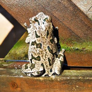 <地道投稿・地主投稿・山野草お友達>大文字草お友達😒水やり(地下水)終わり頃☺️ヒンヤリ部分に「多分 カジカカエル」現る🐸 毎日雨降らず😔日中暑い🔥☀️ 🤔そぅ〰️❗️今年君の美声🦠聞いてない⁉️「この暑さ 声が出ないよ 姿だけ」生きててありがとう😉👍️🎶朝・夕方水やるよ❤️