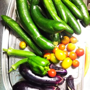 <地道投稿・家庭菜園>おはようございます☀️暑さでサボってました家庭菜園から朝(9時)収穫しました。駐車場に春植え玉葱、小粒ですが20個乾かしてます。