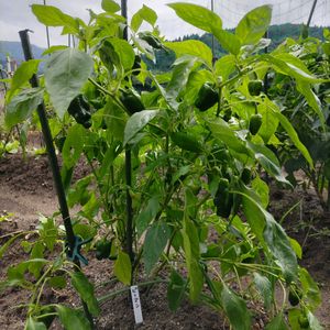 〈地道投稿〉夜に使おうと「シシトウ」収穫中😶カマキリさんから、あっち🤬左に行ってと🙇すいません。後のピーマンを収穫します。