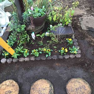 来年春に向けて畑の入り口改善の1段めを実施しました。入り口の左側を近くの家から頂いた擬木で囲みました。更に畑に敷いていた切り株様の敷石を前に敷きました。またジギタリスを3本植えて、奥にあったアベリアとラベンダーを前に移動し、淵に箱買いしたパンジーを植えました。マンホールの上に鉢を置いて、カンパニュラをパンジーで囲みました。ラベンダーのモダルナディディマとシダルセアロザンナは宿根して残っています。ジギタリスは夏の暑さで枯れてしまったので、また植えました。