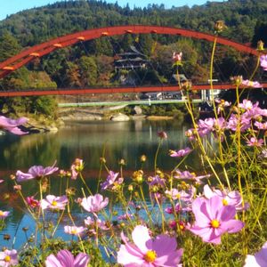 コスモス💞の向こうの⛰️の中腹のお寺。 赤べこの発祥のお寺まで歩きます。 (7)