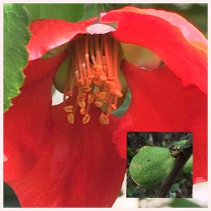 ボケのお花がまだ咲いていました! 実も初めて見ました! 実は、疲労を回復させたり、咳止め効果があるため、ボケ酒やジャムにして食べると良いそうです。