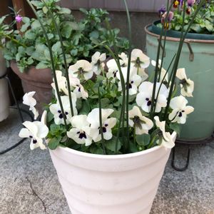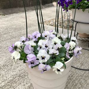 こんにちは☁️ 今日は曇り空で、なんだかパッとしないなぁ〜。 ビオラソルベホワイトブロッチが、やっとモリモリになりました。 あっちこっちを向いていますが、紫がかった白いお花がかわいい。 後ろに伸びているのはムスカリ🌱 共演が楽しみです💓 今日も良い1日になりますように✨