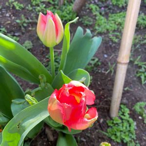 並んで咲き出したチューリップ🌷 葉が大きい気がしますが、来年はいくつかの色の球根を植えようかと今から考え中〜✨ 次に咲く花が後ろで準備中〜😊