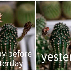 👉サボテンの花👈 昨日、一昨日と咲きましたが、同時にはさかな〜い😅 種類もよくわからない多分ダイソーサボテンかな🤔いつ来たかも覚えてませんが、へんてこな形で愛くるしいです💕