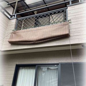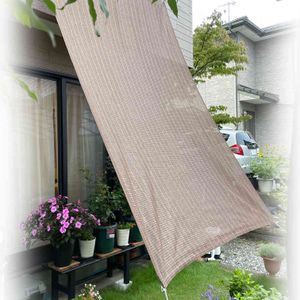 今朝、昨日作業して形にした物を庭に取り付けしました☺️ このサンシェード😎は、左右に移動と風が強い時は束ねる様に工夫しています☺️ 少し下からの画像です☺️ 【追加】 90cm×180cmのウインドオーニング1枚に、ハトメを12個追加で付けて、180cmのグラスファイバーの棒を2本、ウインドオーニングのロープを通さない2ヵ所に巻き込んで固定。 同じ物を3枚作って、庭のフェンスにロープを張りながら、この3枚のハトメの穴にロープを通して完成です☺️