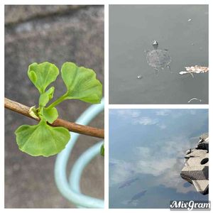 こんにちは♪ 先日芽吹きシリーズで投稿してますイチョウの葉っぱが可愛く開いて来たので投稿致しまーす‼︎ 1✖️1.5cmくらいで ホントにかわいい💕 右はいつもの川で7:00くらいの写真ですが今日は朝からお日様が出ていて亀さんもご覧の通りです♪ 水も温んできたのかなぁ 🤗