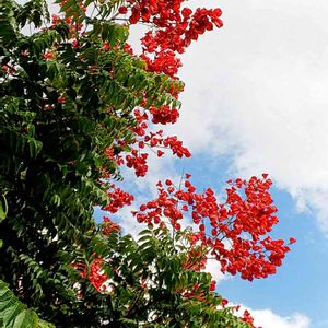 おはようございます😊 今日も最低気温6℃と冷え込みましたが青空はとても澄んで綺麗です。 朝🐶散歩で行った公園の「タイワンモクゲンジ」とても綺麗に青空に映えてました❣️赤く花に見えるのは果皮でその中に5ミリ程の種子が入ってるそうです。その種子で数珠やネックレスが作られるそうです。