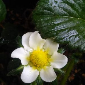 雨にぬれた🍓の花☆★ 一番花💮です。 後日記; このイチゴの花びらは7枚。友人宅のイチゴの花びらは5枚だった??? 🔍と、決まった数はないそうで、多い程、生命力があり大きい実ができるそう😃 期待して良いのかな?