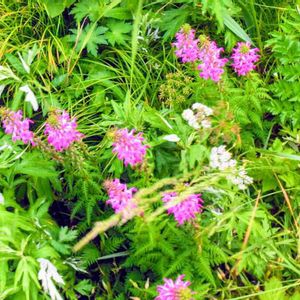 エゾチドリ ラン科 別名 フタバツレサギソウ 径2センチ程の花が多数付く。 大きい根出葉か2枚茎を抱くように付く 🌼高さ50センチ程あり ☘️見事でした👍 🌼礼文島の高山植物園にて💕