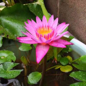 雨上がりの睡蓮鉢 お陰様で昨日の豪雨にも特に被害は出ませんでした。