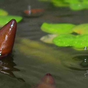 二つ目の蕾も水面から出てきました。 雨で跳ねた水滴が上手く写りました。