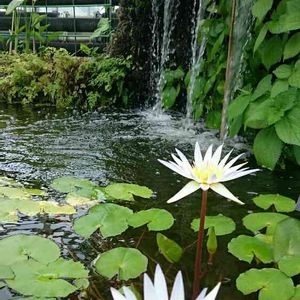 睡蓮 ドーベン。 滝の水が涼しげに流れる空間で白い睡蓮が咲いていました。他にも幾つかの種類の睡蓮があり、どれも綺麗でした💠 HIBIYA-KADAN 大船フラワーセンターにて。