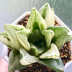 最近まで葉が閉じていて、ニョキっと生える何にも目立たない地味子ちゃんでしたが、ようやく葉が開き始めました✨✨ 徒長気味だけど、その方が斑が綺麗に見えるもんねー(ひらきなおり💧) ムチムチで元気いっぱい。焦げないし、新葉もしっかり斑入りの、いい子ちゃん❣️です😆
