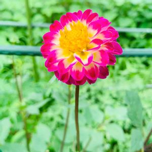 長雨で枯れ枯れになりそうだったミニダリア。 ダメ元でザックリカットしたら脇芽?からか根元からか出てきてやっと咲きました🌼*・ ですが前に倒れて来て花が下向き⤵️ なんでこうなるのか… コニファーに当たってチクチク痛いからか?🙄😆💦 せっかく咲いてきたのでボキッとなる前に麻紐をダリアの茎に引っ掛け、グィ~と持ち上げ、コニファーの太い茎に縛りました✌️😊 顔が良く見えて隣のアルテルナンテラも良く見えるようになりました✨ この後のpicに寄りでUPします☺️