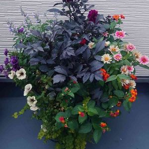 台風の前にベランダに避難シリーズ 風雨にやられてしまう前に今の姿を記録 夏の寄せ植えその① 30型のプランターに植えたけれど随分と育ちました… 銅葉のダリアもペチュニア達もダークな雰囲気のものをチョイスしたので、「魔界」と呼んでいた寄せ植え
