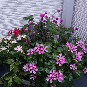 雨風をよけて、移動できる鉢はルーフ付きベランダに移動 花畑になった 時折強い雨が降るけれど、屋根があるからここなら安心 手入れをしながらゆっくりお花と向き合える幸せな休日の朝でした もしここでも台風の風にやられてしまったら…あきらめて秋冬用をお迎えしよう…