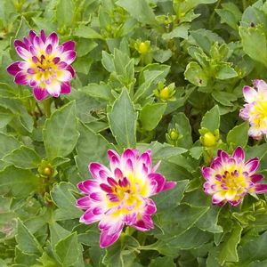色鮮やかなミニダリア・ハーレクイン♥️ 可愛いくて明るく元気にしてくれます♪(๑ᴖ◡ᴖ๑)♪ 花弁の内側に違う色の副弁が入るコラレット咲き❣️ 早咲きダリアです♡