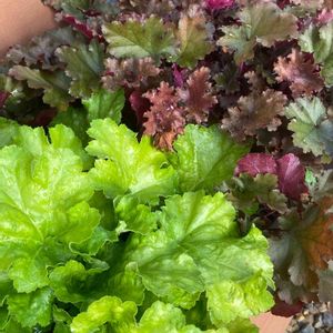 ヒューケラ紹介。 上はピーチクリスプ。…今のところ、ピーチ感はない。 下はレモンシュープリーム。安定のレタス感。