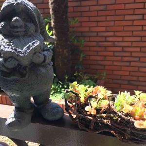昨日、ワンダーデコールからお迎えした2人。 左はガーゴイル。 ガーゴイルって本当は雨樋の吐水口に居る悪魔、竜などの事らしいですが、イングリッシュガーデンではお庭の魔除けとしてこんな可愛らしい(もっとおどろおどろしい子もいたり、怖い顔の子もいたりしますが)姿になったそうです。 もっと大きな子が良かったのですが、狭い私の庭にはこのくらい小さな子で良いのでは、と思ってこの子をお迎えしました。 右はノーム。 大地の妖精さん。 お庭にお迎えするとそのお庭でガーデニングのお手伝いをしてくれるそうです。 この妖精さんはお昼寝中。 良く見ていただくと足下に愛犬も寝ているのがわかりますか? 妖精さんは娘が一目惚れでお迎えしました。