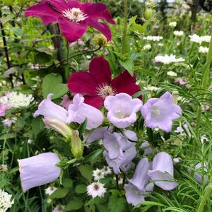こんにちは 薄曇空で 少し寒い月曜日です 今朝の庭に咲く花達 クレマチス紅 カンパニュラ ニゲラ シモツケ 仲良く咲いています💞