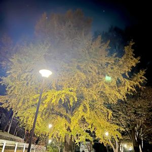 🏷️黄金色の金曜日🏷️夜散歩 イチョウが続きます💛 こちらは公園の大きなイチョウ。 何年か前の台風で一部の枝が折れましたが、元気です💛✨ 久しぶりの外食の後、30分歩いて夜のイチョウを見て帰りました。 街頭にライトアップされて幻想的でした✨✨✨