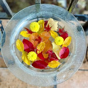 庭に出たらいろんな色の葉っぱがあって、でも落ち葉アートするほどの量はないから水に浮かべてみました。 古くなった切り花のマムを浮かべたら華やかさもUP 黄色はイチョウ(盆栽)、ノリウツギ オレンジはサクラ(盆栽) 赤はモミジ(盆栽)、ブルーベリー
