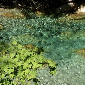 阿寺渓谷で 📸 9月26日 ①楓越しの狸ヶ淵 ②③狸ヶ淵付近 ④右奥は阿寺川橋梁(廃線) ⑤浮かぶ落ち葉と川底