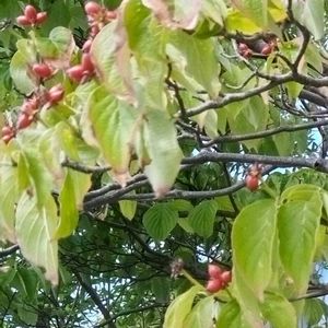 🏷️あっ火曜日 🏷️真っ赤な火曜日 ハナミズキ 花水木 ①②③赤い実沢山 ④ 花芽も沢山 ⑤ 家の中より木の間の沈む 太陽をpic 落ち葉🍂掃除が大変になります