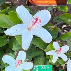 ハワイと言えば・・・ ハワイ固有種のハイビスカス🌺 ワイメアエ🤍🌺🤍 カウアイ島原産 特徴は花柱が赤一色で、花弁の縁が丸みを 帯びており、香りが強めのせいか、 蜜蜂🐝さん達が、沢山、来ていました。 クィーンカピオラニガーデンにて