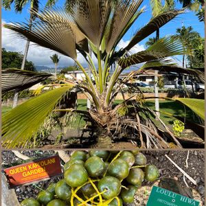 ハワイと言えば・・・ ハワイ固有種のパームツリー オアフ島原産 ロウル・ヒワ(ヤシ科) 特徴は、うちわ型の葉、果実は球形 実は成熟度に従って、 緑→黄→茶→黒 に、変色するそうです。 クィーンカピオラニガーデンにて