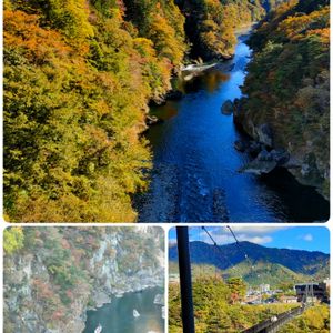 旅行支援を利用して、紅葉の鬼怒川、日光へ。 空を写した川面が美しいです😍 ライン下りの舟がタイミング良く🚣 此後は温泉宿へ♨️