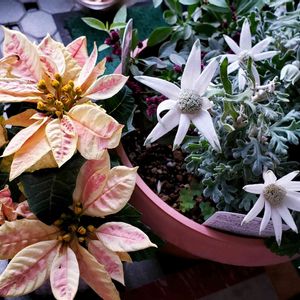 ポインセチア フランネルフラワー 12月に入ったとたんにめっちゃ寒くなったので、この子達は夜は玄関に😃