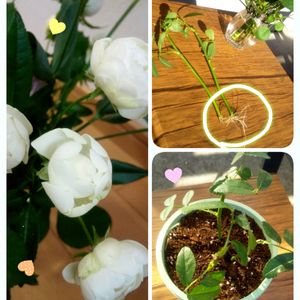 5週間ほど前、切り花で買ってきた白いバラ、たぶん「シェネープリンセス」だと思うのですが…🤔 ずっと水差しで根っこが生えるのを待っていて、だいぶ伸びてきたので、鉢に植えてみました❗️ ちゃんと育ってくれるかな❓️😁