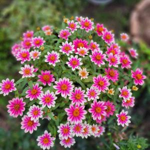 種まき ジニア プロフュージョン チェリーバイカラー 地植えにした子はセンニチコウに飲まれて消えた😱 鉢植えっ子は元気 でも、ピンク強め😅