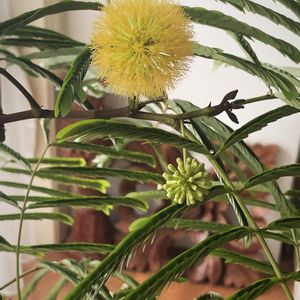 我が家の一番大きな観葉植物はエバーフレッシュです。 朝起きていつものように葉水をあげていたらてっぺんに花の蕾を発見! 今の所ひとつだけだけど いつ花が見れるのだろうと待ち焦がれた年月 ついにそれを見れる日がやってきました🥹 1個だけじゃ実は期待できないかな? 暑さに負けずによくここまで育ってくれました。 毎日寝起きを共にして可愛がってきたエバさん 寒い時期は、寒さで枯れてしまうのではないかと心配したり 見ているだけで楽しい習性を持つ観葉植物でした。 やっと3年経って居心地良い環境になってくれたのかな 花を咲かせるには条件があるって言われていたので やっと順応してくれたようです。